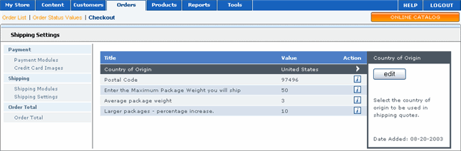 Merchant Manager enables you to control how shipping and packaging is handled. For example, you can specify the default values of shipping options and specify a maximum package size you will ship.
