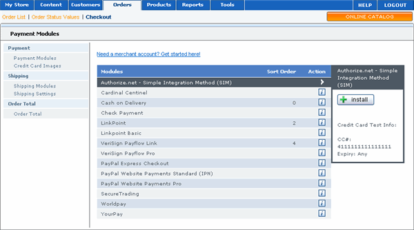 The following sections provide general instructions for working with payment modules. For provider-specific information, see the appropriate sections in this Help section. For Shipping Modules, view Managing Orders.