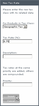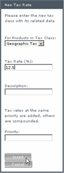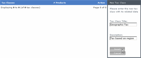 Enter the name of the new tax class and a description (optional). Click Insert.